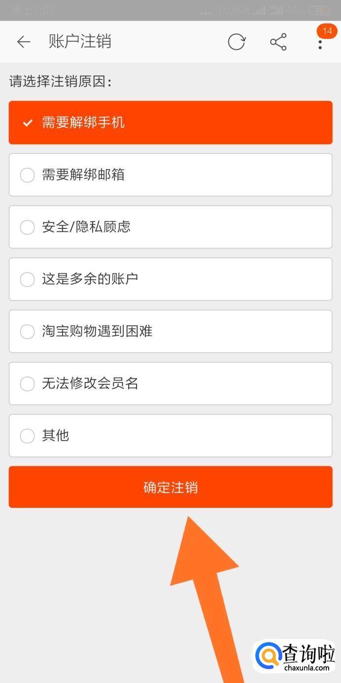 最后勾选注销淘宝账户的原因,点击“确定注销”按钮即可注销淘宝账户。
