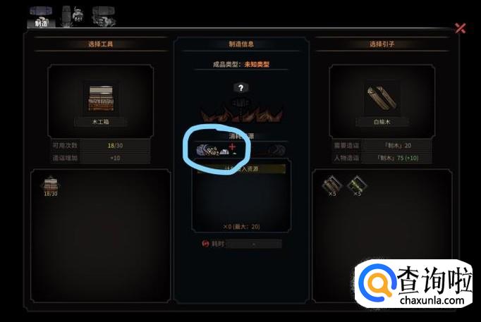 在界面中央的加号处不断点击增加制作需要的资源