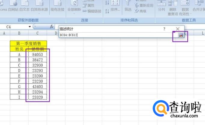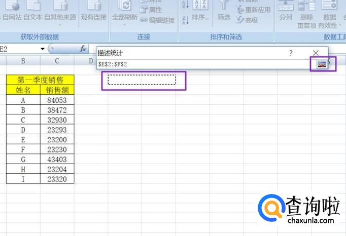 弹出的界面,我们选择输入区域的引用符号,然后选择销售额的数据,然后再点击引用符号;