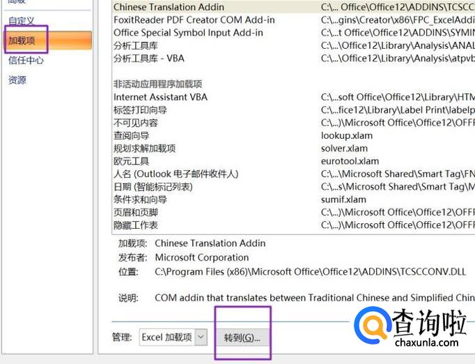 弹出的界面,我们点击加载项,然后点击转到;