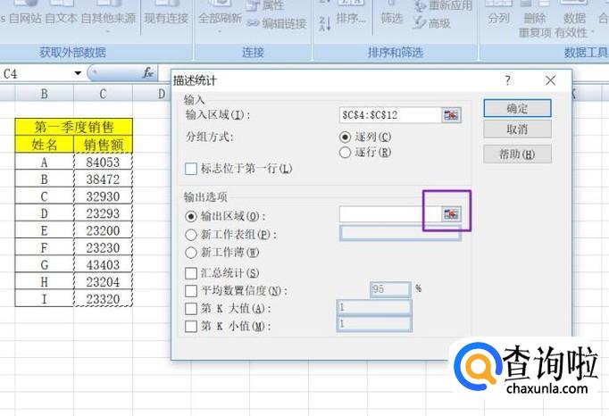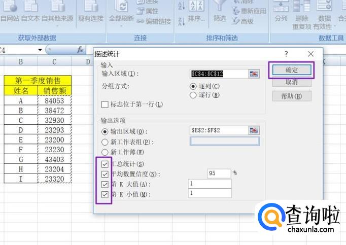 弹出的界面,我们将汇总统计、平均数置信度、第K大值、第K小值均勾选上,然后点击确定;