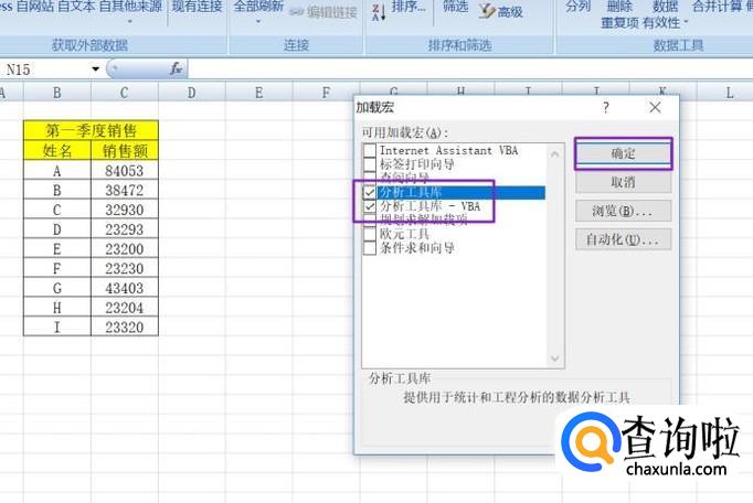弹出的界面,我们将分析工具库和分析工具库-VBA均勾选上,然后点击确定;