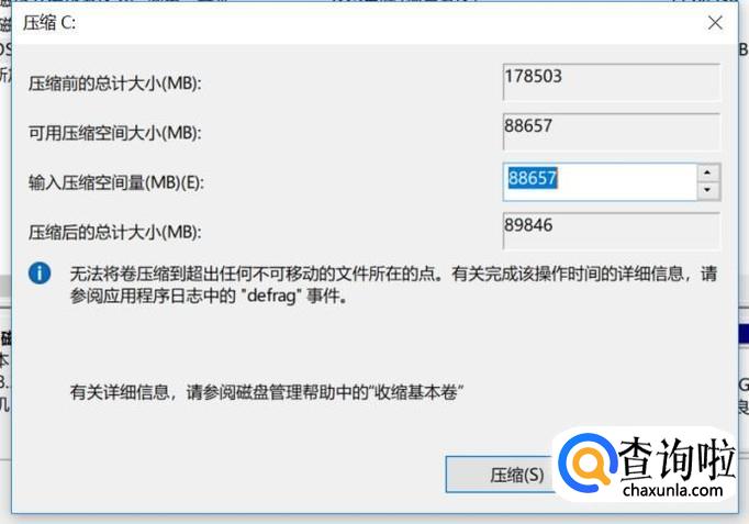 点击过之后,出现了一个弹窗。页面中的数字使C盘的容量,我们要把它改小一点。如果你想分出一个50G的盘,大概输入51396MB就可以了(为什么说大概呢,因为很难算得到整数)。
