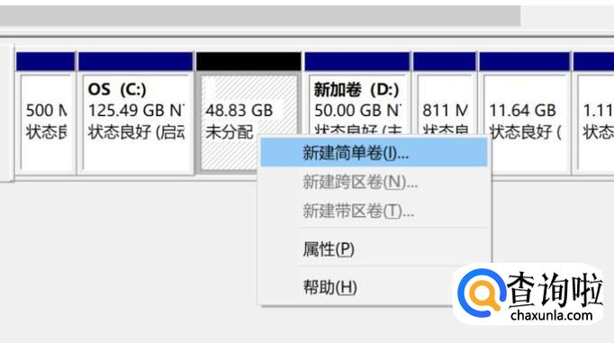点击未分配的磁盘,右键之后,再点击新建简单卷。