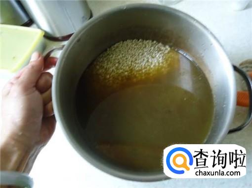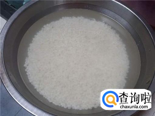 将南烛叶碎末沥干,把之前准备的糯米倒入汁水中,要浸泡五个小时以上,这样才能保证糯米被彻底染黑。