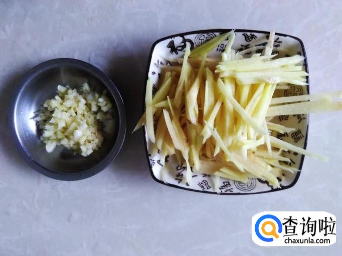 仔姜切成丝,蒜蓉准备好。