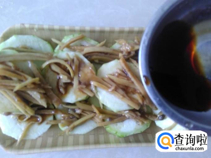把姜丝、蒜蓉铺在丝瓜面上,然后浇1勺生抽、1勺香油上去。