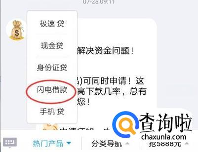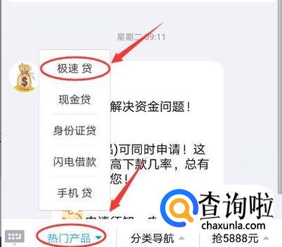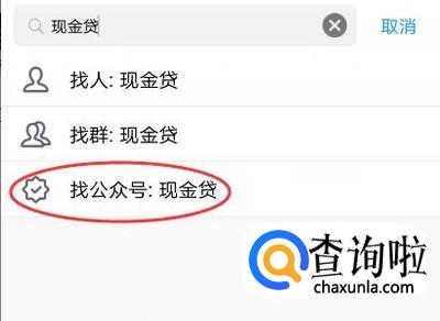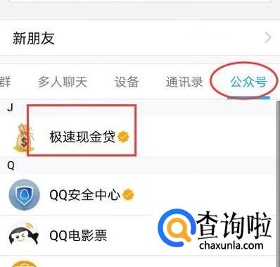 关注后在联系人页面点击“公众号”,然后进入借贷公众号的对话框。