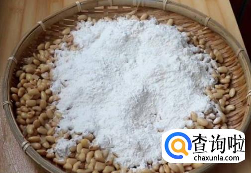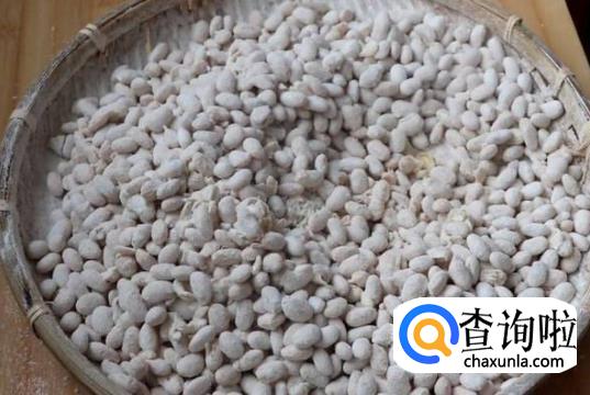 在一个干净没有水分的簸箕中加入黄豆,将面粉倒入,然后轻轻上下抖动,将每颗豆子上面都裹上面粉。