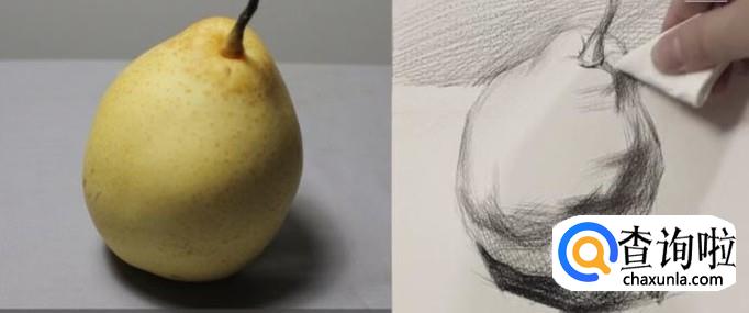 顺着梨面画出阴影部分的暗部线条,然后用卫生纸涂抹梨身,使线条变得均匀