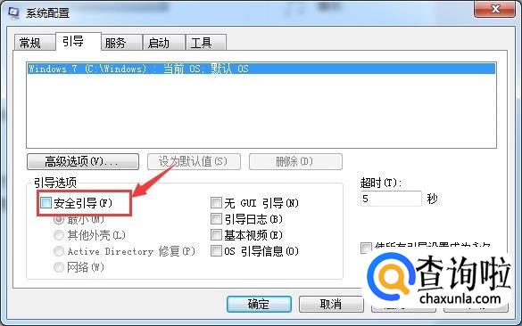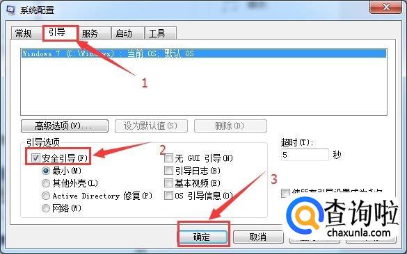 单击系统配置的“引导”选项卡,勾选中“安全引导”选项,及选中下面的“最小(M)”,单击确定按扭,然后重启电脑。
