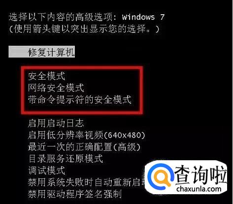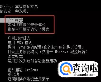 在电脑刚开机的时候,也就是屏幕还在出一些英文字母的时候就一直按F8,再松开再按下再松开这样不停的按,直到出现如下图所示的Windows高级选项菜单为止。然后在Windows高级选项菜单中,使用方向键移动到“安全模式”中然后确定即可。