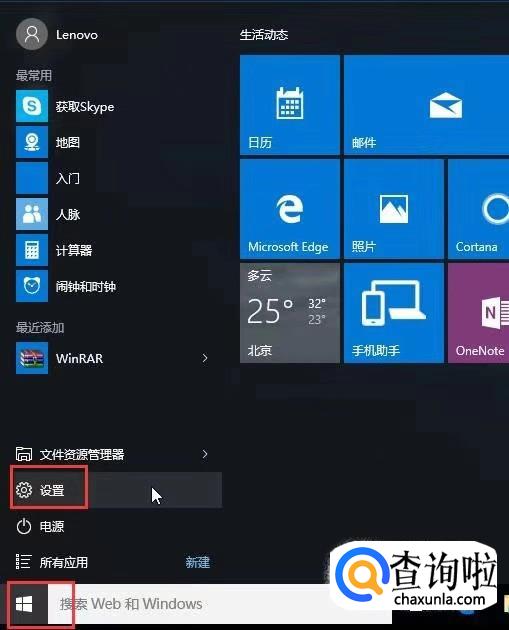 进入Windows10桌面后,点击开始菜单,然后再点击“设置”。