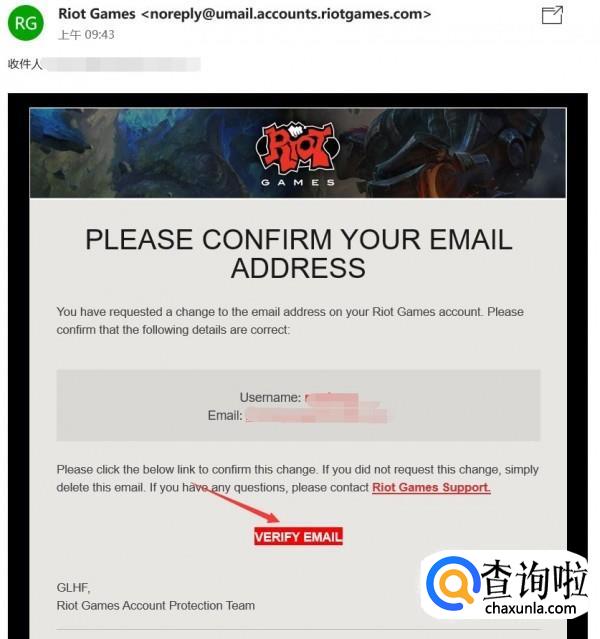 然后拳头公司会下发一个验证邮箱的邮件,如果找不到的话,可能会在你的垃圾箱里面。点击红色部分~等待跳转完成即可。一旦资格申请通过,就可以开启lol美服测试服了。