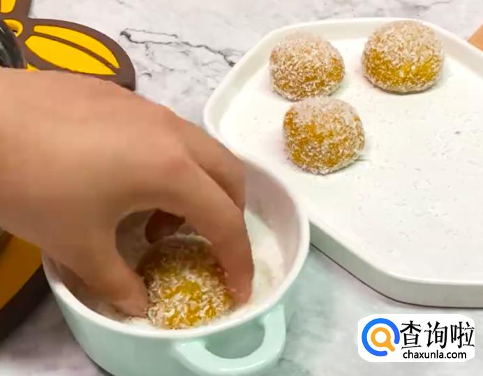 将整个南瓜圆子放入椰蓉里,裹上一层椰蓉即可食用。