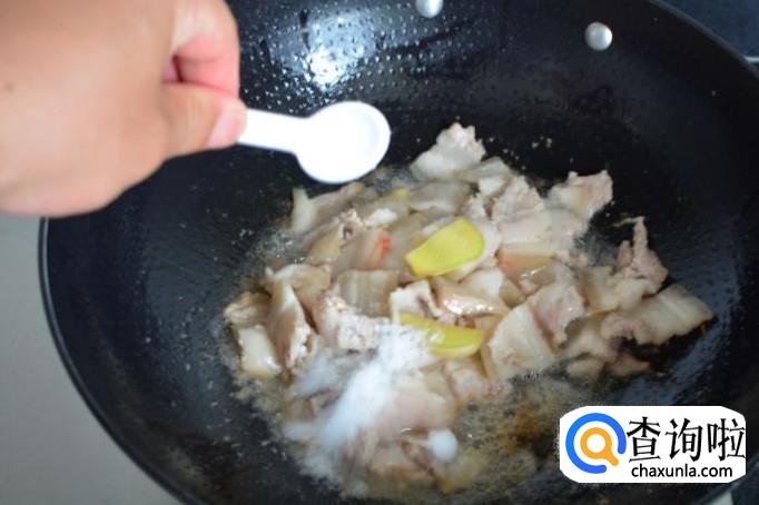 待猪肉稍许变色,依次放料酒、白糖,继续翻炒片刻。
