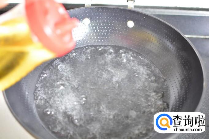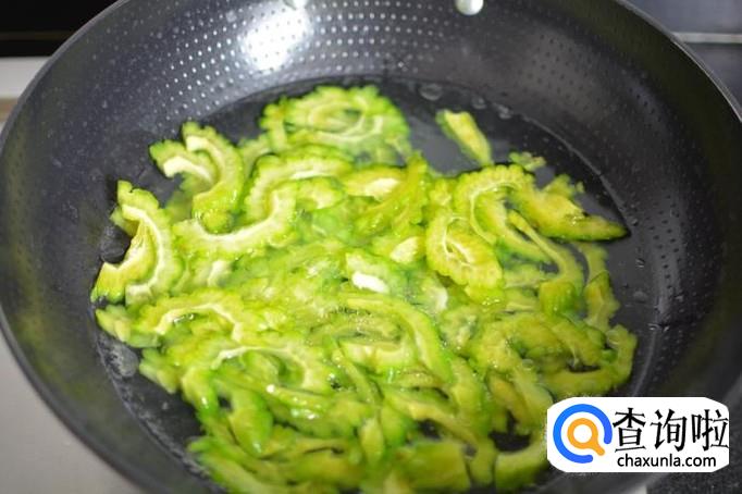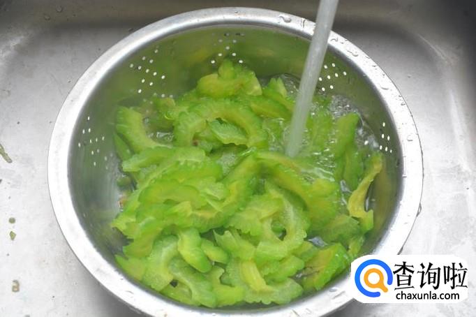 这个时候苦瓜还是有残留苦味的,在锅中烧适量开水,水开后放入少许盐,滴入几滴油,将苦瓜焯一下,进一步去除苦味。焯水时间不宜过长,以免影响苦瓜的口感,焯水后立即用冷水过凉。