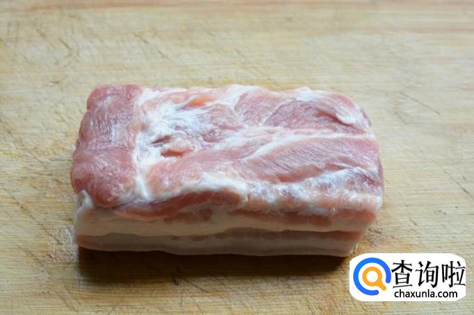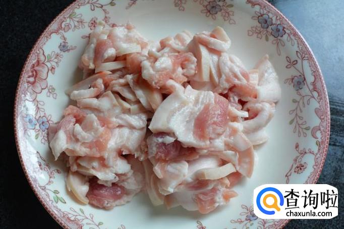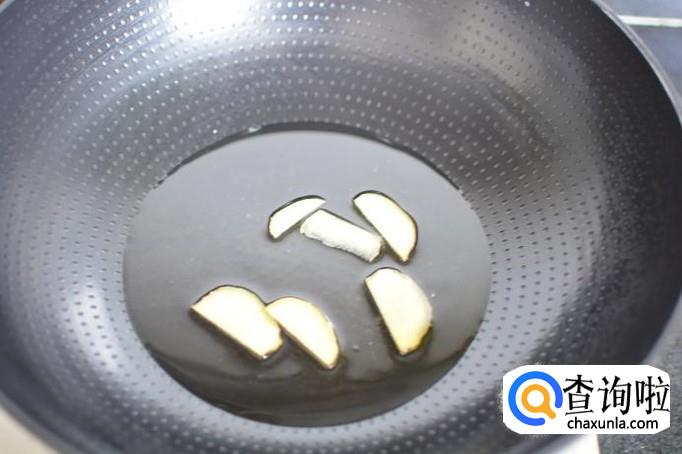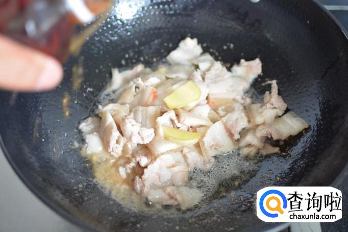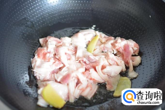起油锅,放入姜片,待油温8成热左右时放入猪肉煎炒。