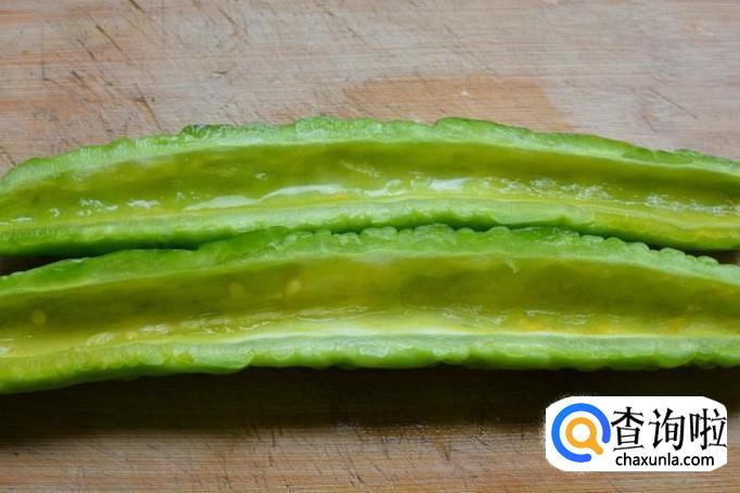 将苦瓜洗净对切,去其瓤,图中黄色的部分一定要去除干净,那是苦瓜最苦的部分。去除后切薄片,五花肉也切片待用,喜欢猪肉嫩滑的朋友可以撒点生粉腌制5分钟。