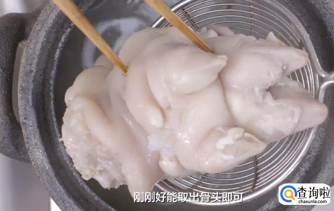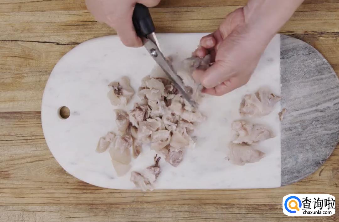 猪蹄炖好后放入冰水中降温,猪蹄凉透后剔去大骨,将肉剪成小块。
