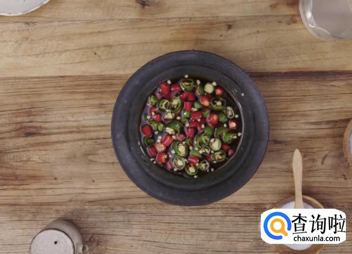 做一个凉拌汁,碗里放入炖蹄花的原汤,加入白糖、白醋、盐和酱油,再放上青椒圈和小米辣,搅拌均匀即可。