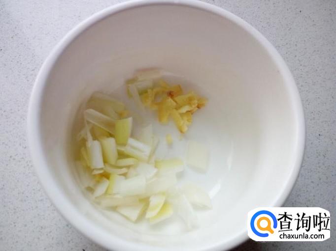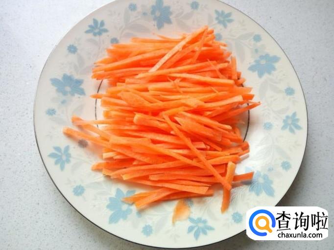 胡萝卜用水洗净,切成细丝。切好葱,姜,备用。