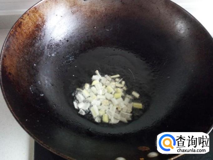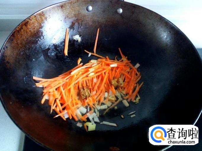 锅内放油加热,油热后放入葱,姜爆锅,放入胡萝卜丝,五香粉,翻炒。