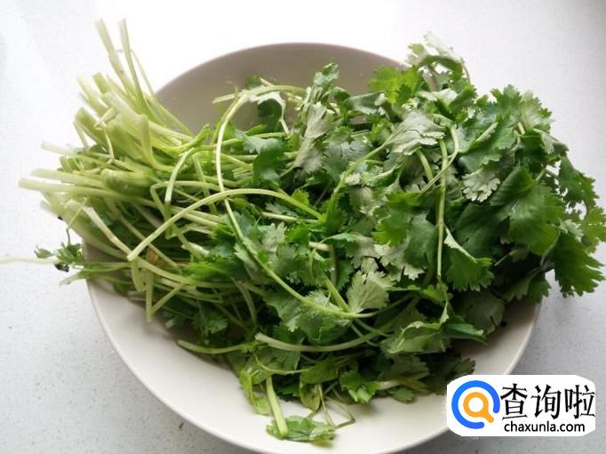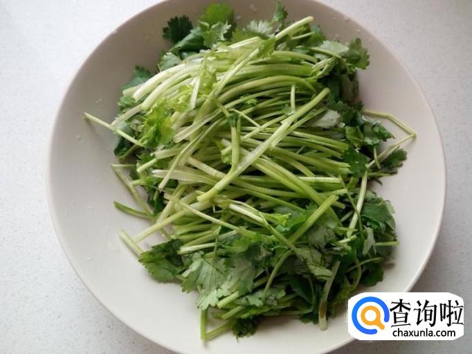 香菜用水洗净,控干水分,切成10公分左右长的段,备用。