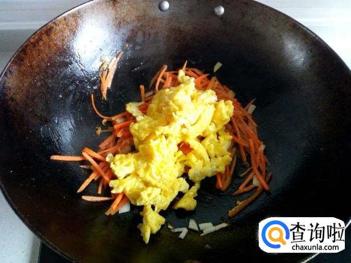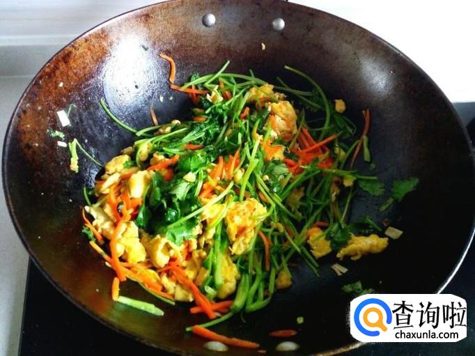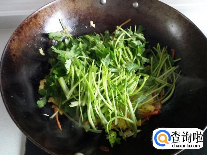 胡萝卜丝变软后,放入鸡蛋,略翻炒一下,随即放入香菜,放少许盐,快速翻炒。