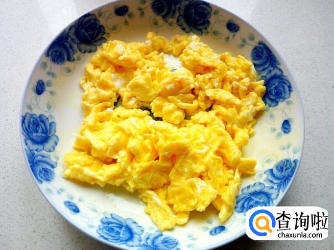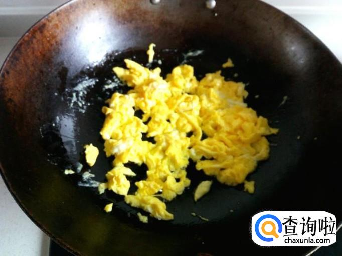 然后用锅先把鸡蛋炒出来,炒至七分熟即可,装盘备用。