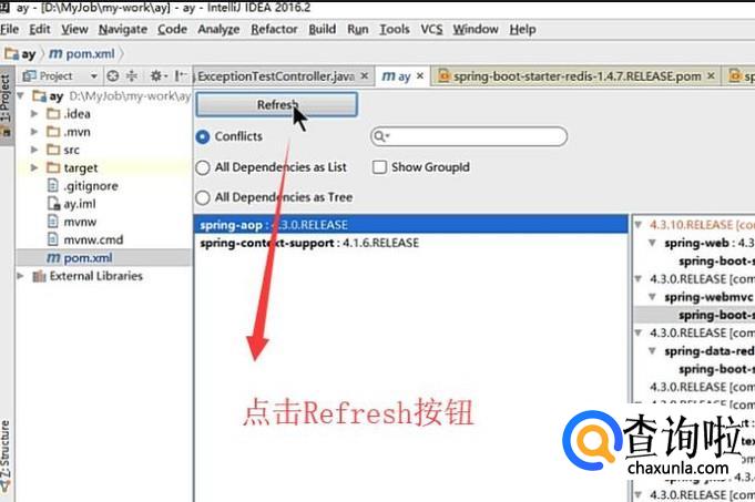 然后会弹出项目的依赖选项界面,我们需要先点击一下顶部的Refresh按钮,如下图所示