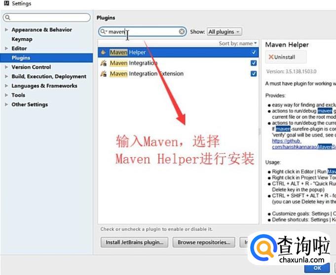接下来在弹出的Settings界面,我们选择Plugins选项,在输入框中输入maven选项,然后在检索出的结果中选择Maven Helper选项进行安装,如下图所示