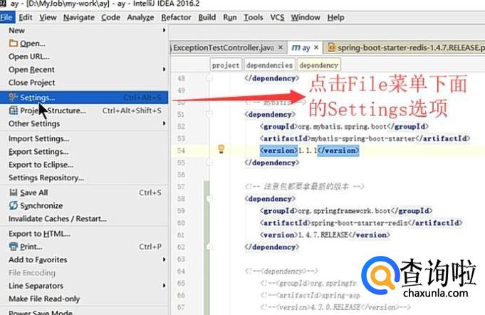 首先我们打开Intellij IDEA软件,点击顶部的File菜单,然后选择下拉菜单中的Settings选项,如下图所示