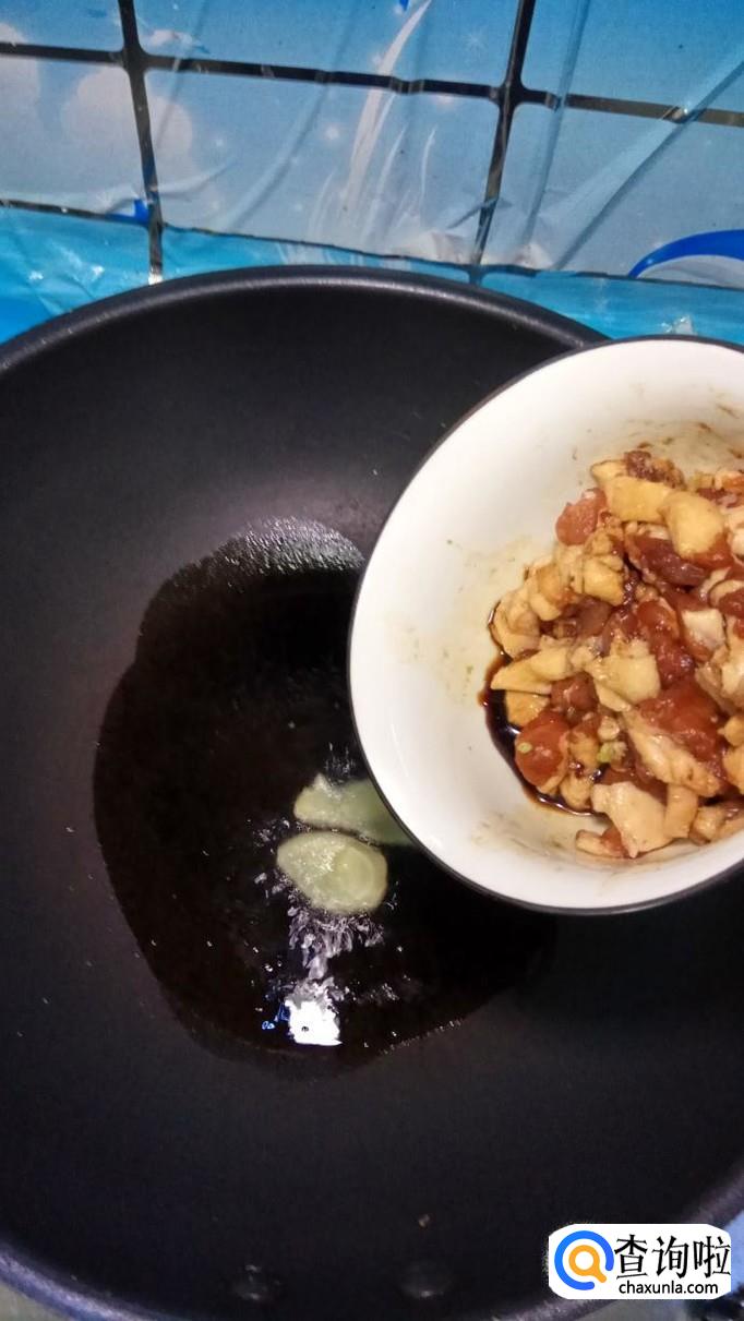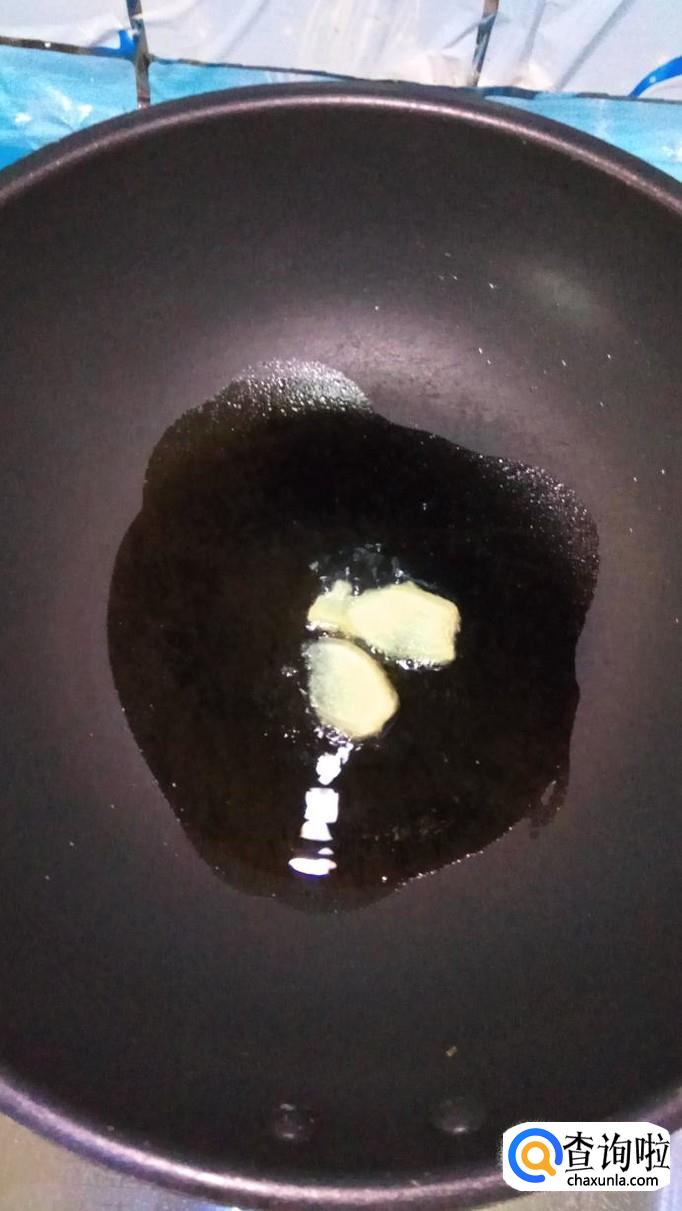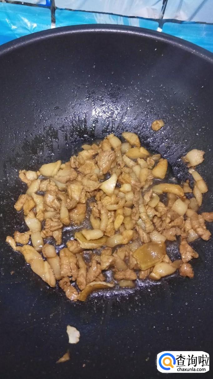 炒锅中放入适量油,油热后放入姜片爆香,然后再加入腌好五花肉,炒出香味儿。