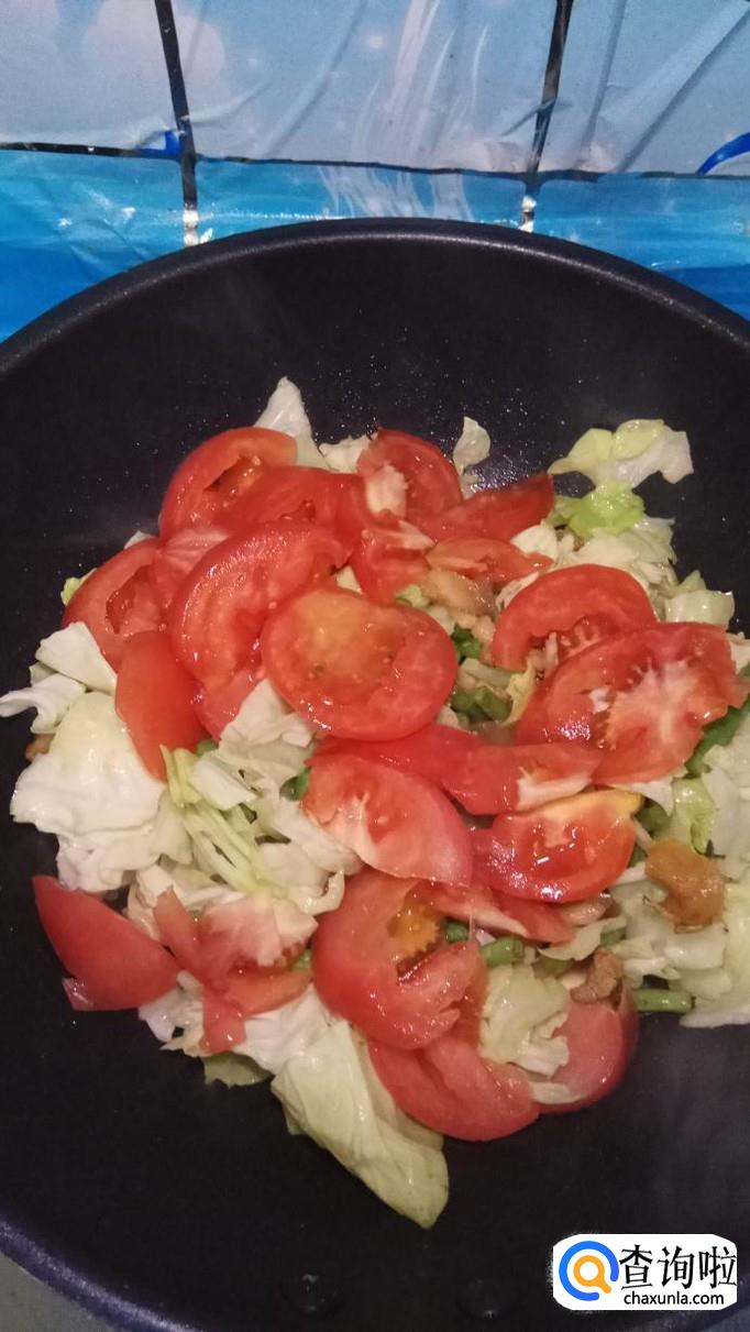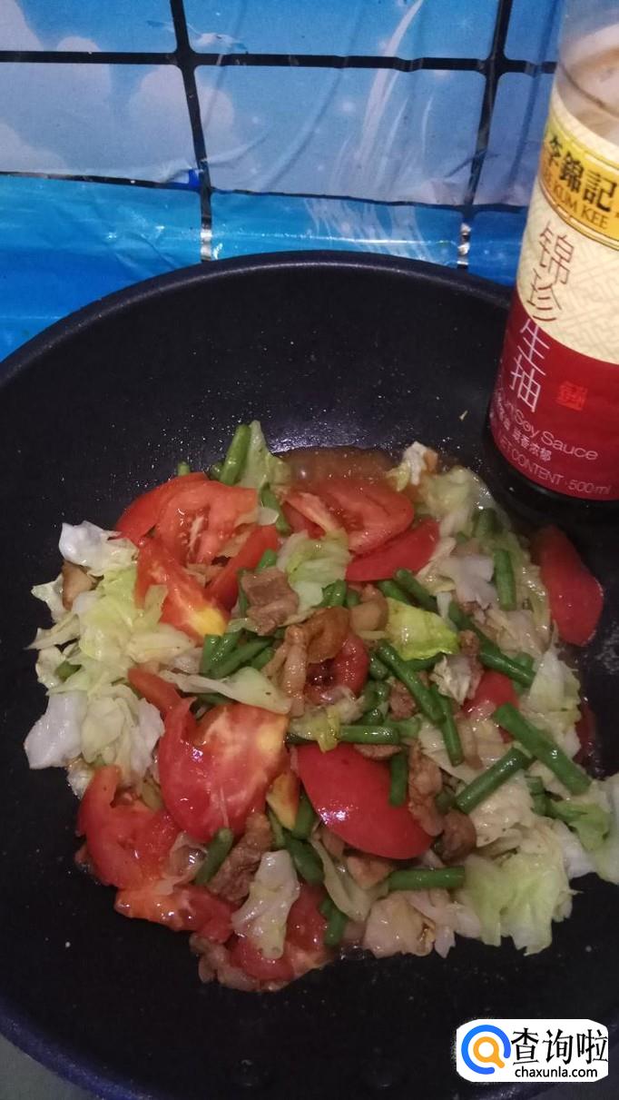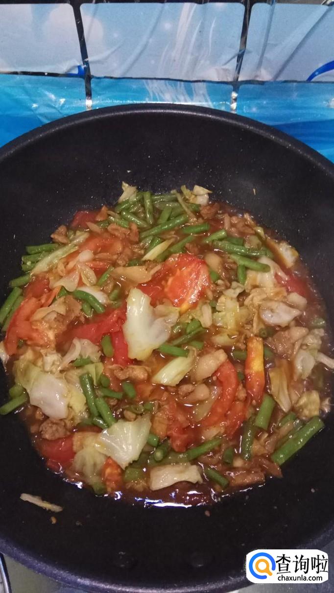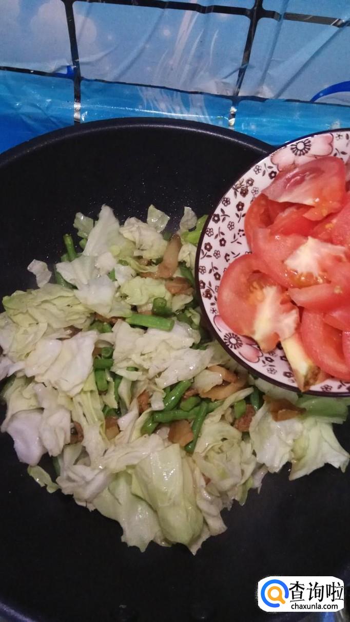 再放入准备好的包菜和西红柿,与豆角一起翻炒,炒至西红柿变软就差不多了。