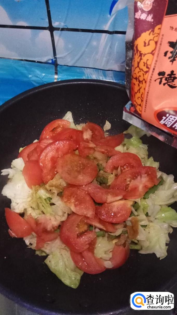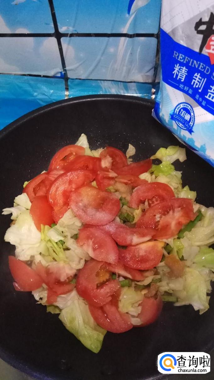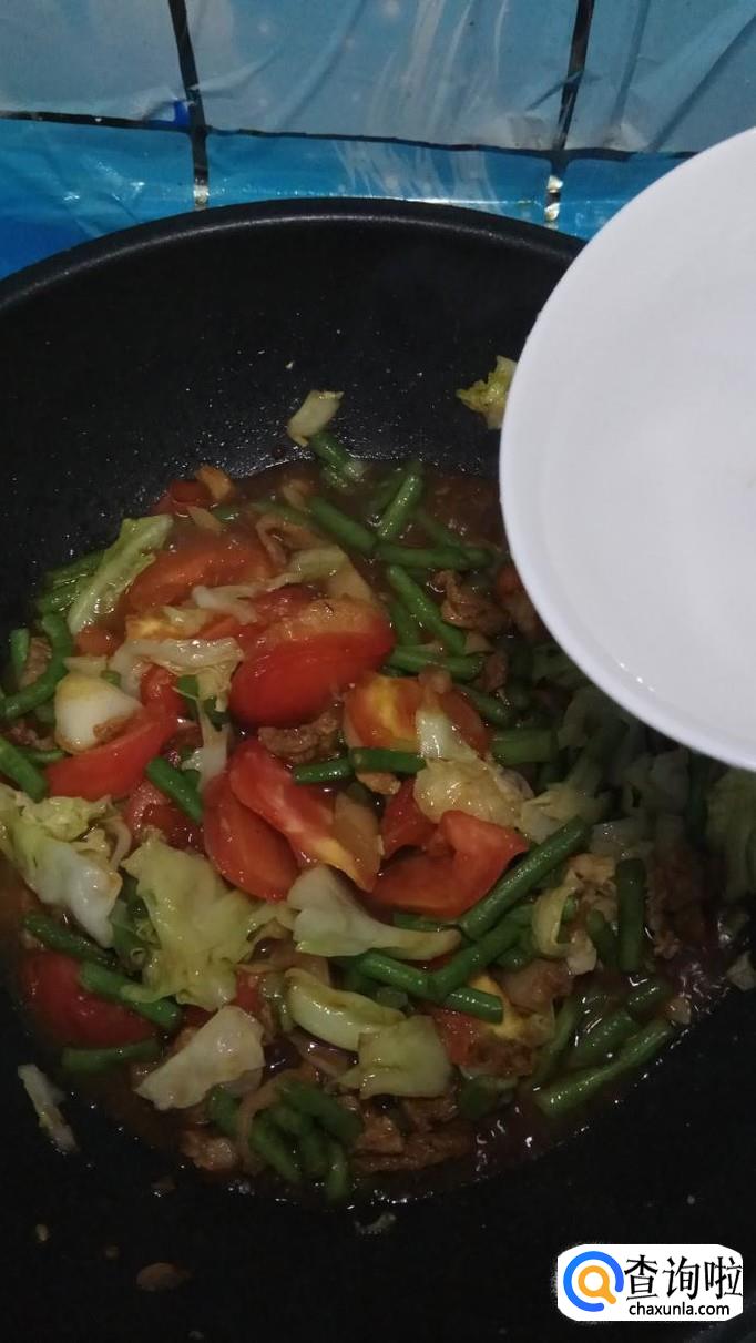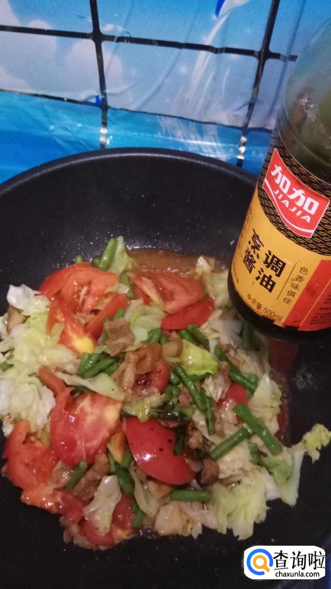 再放入准备好的包菜和西红柿,与豆角一起翻炒,炒至西红柿变软就差不多了。