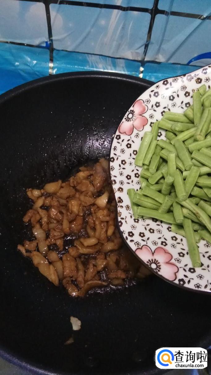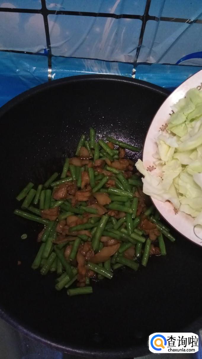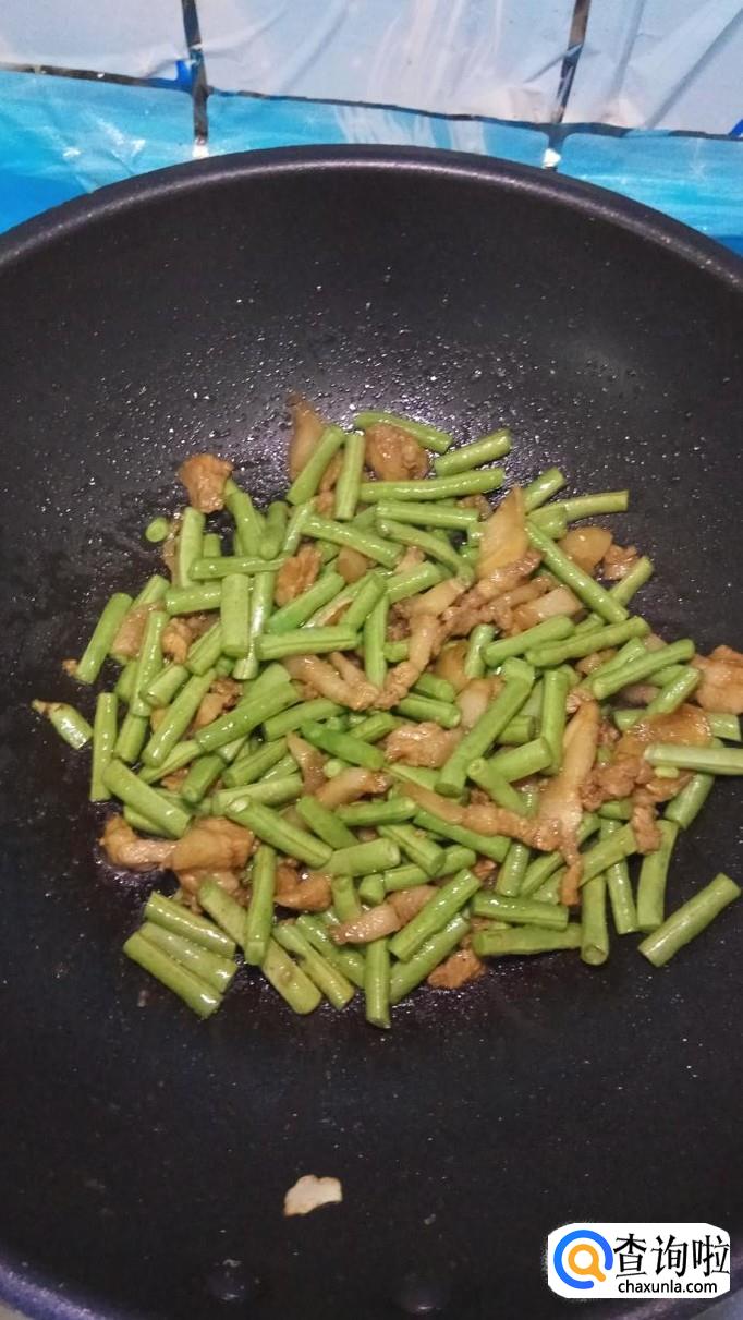 然后将准备好的豆角放入锅中,和五花肉一起翻炒,豆角比较难熟,所以要先放进去。