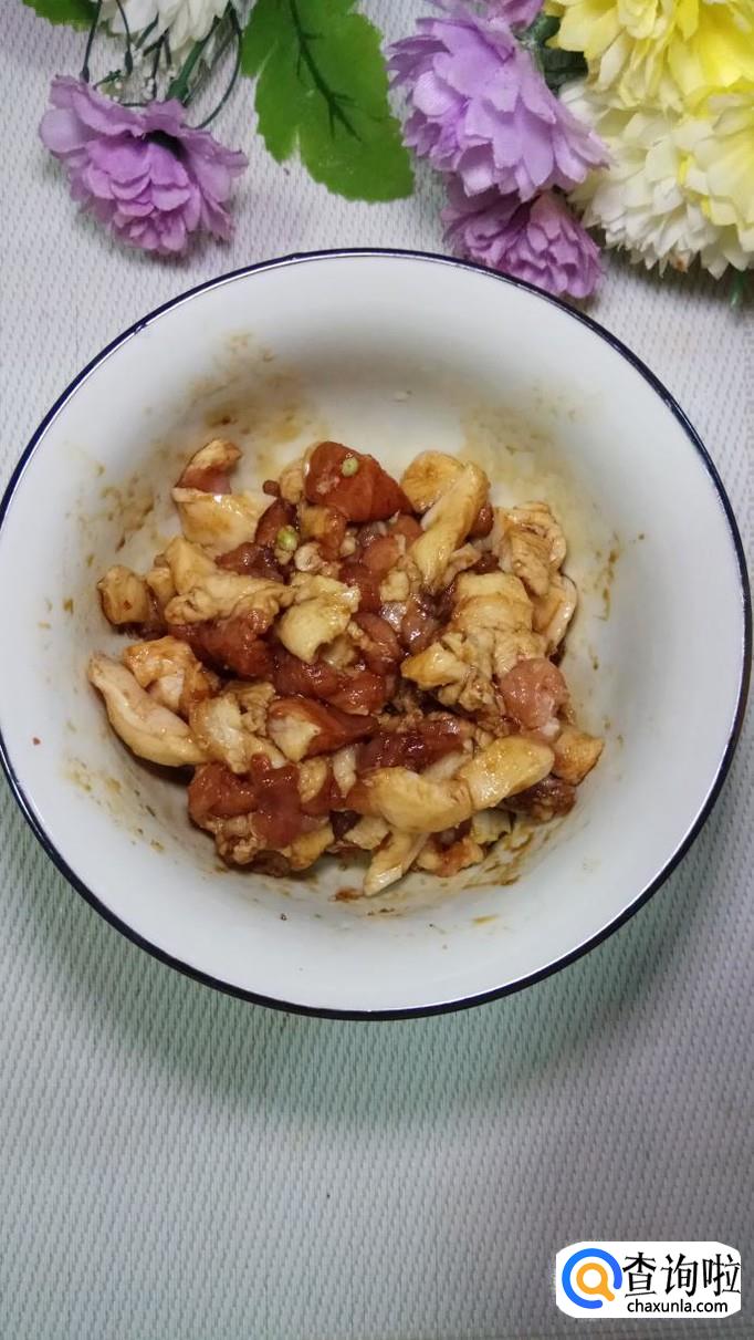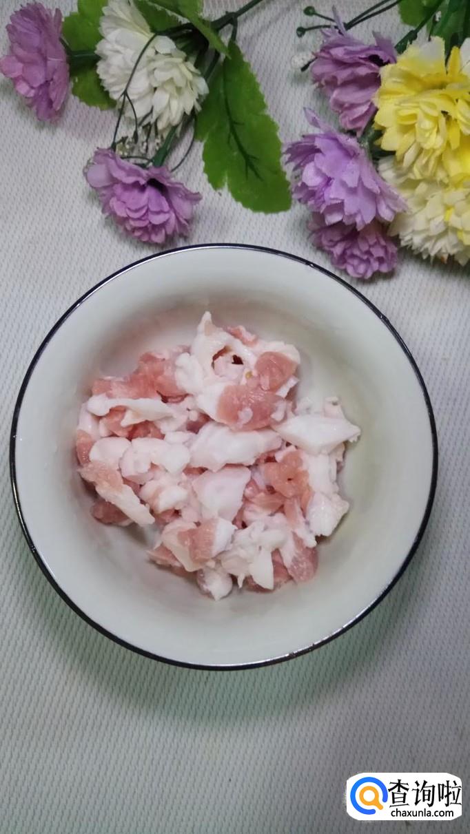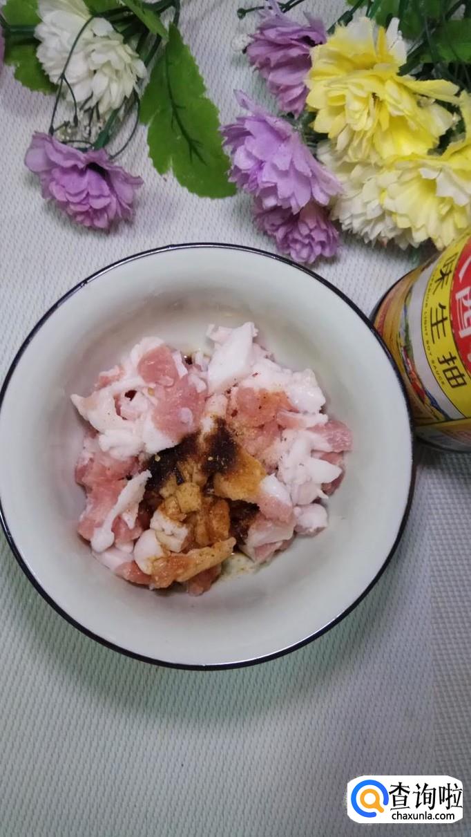 准备适量新鲜的五花肉,洗净后切成丝,加入适量盐,五香粉,生抽,老抽,料酒,青椒末,腌制15分钟。