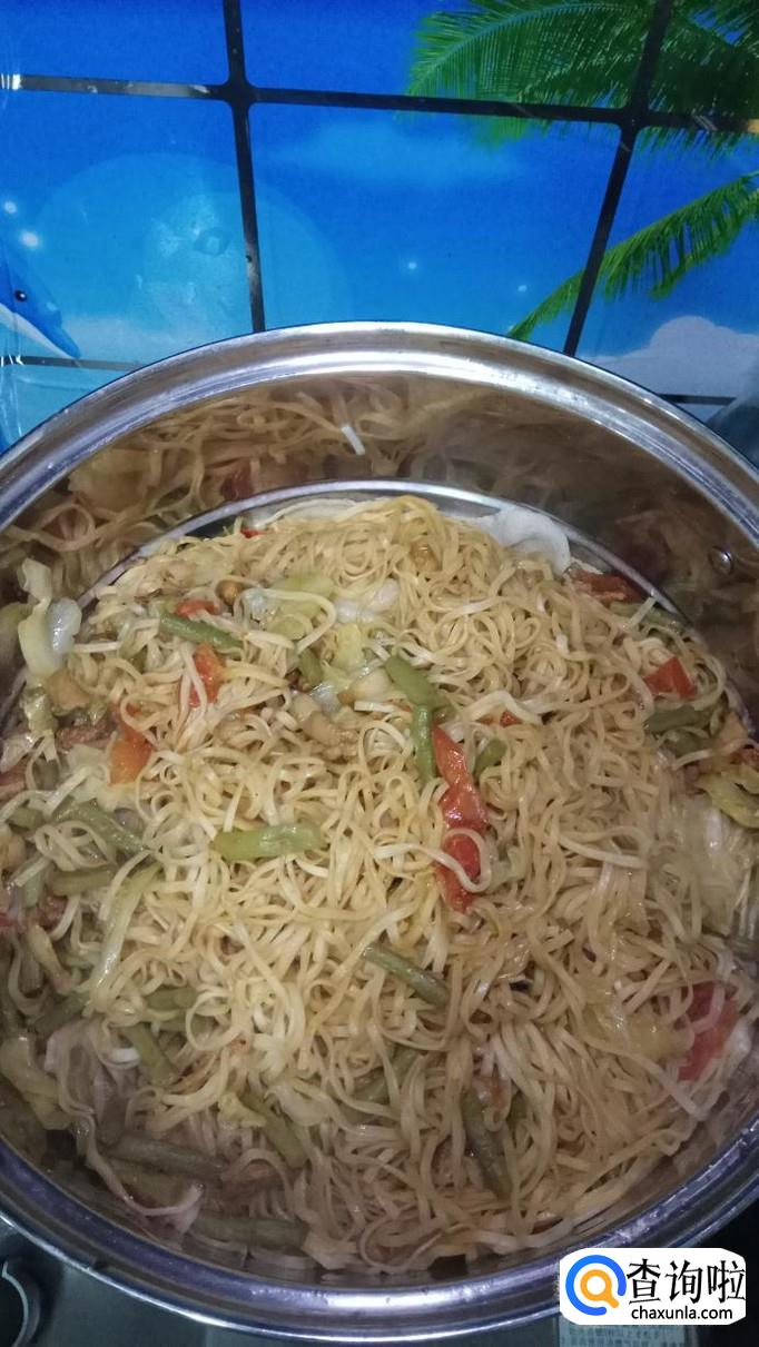 将蒸好的面条放入锅中,和蔬菜一起翻炒,让面条均匀的沾上一层菜汤。