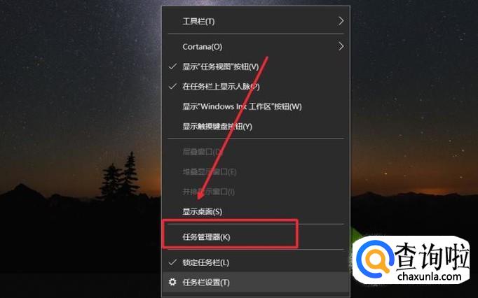 右击底部任务栏,点击任务管理器,或者键盘按下k键。