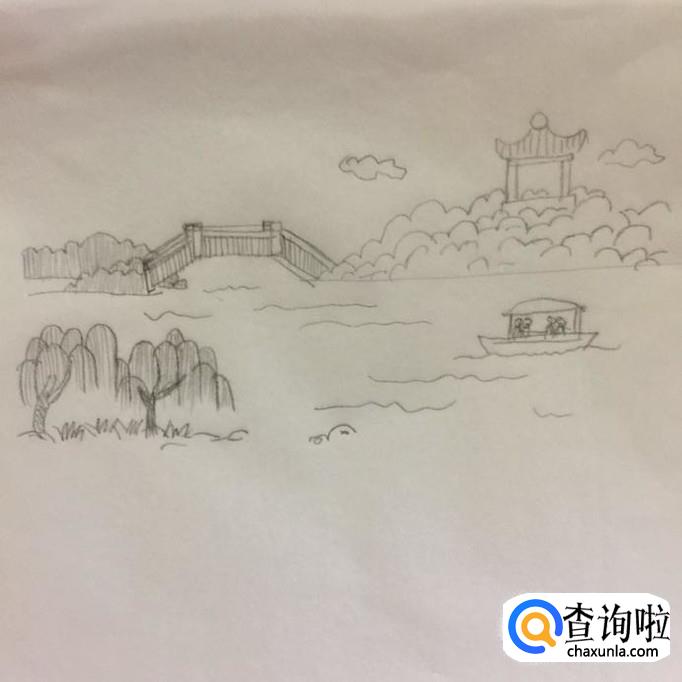 接着在湖面上画出一艘小船以及船上的小人,如下图所示。