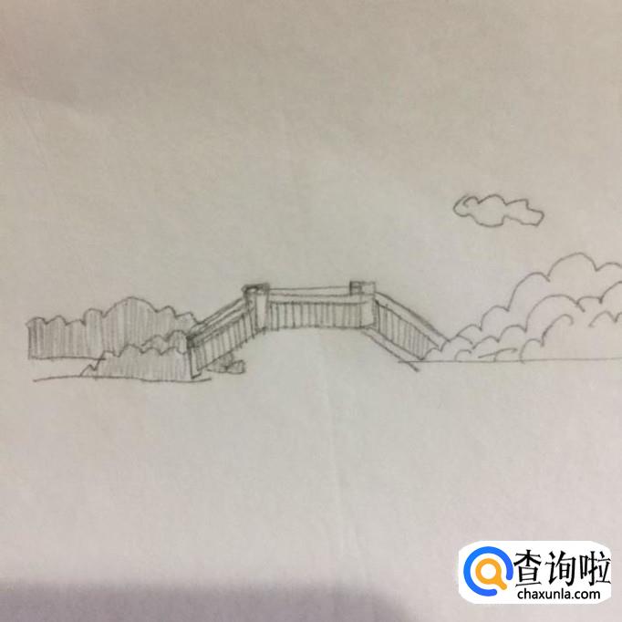 接着在树木的左侧画出一座拱桥,如下图所示。我们在画这部分的时候,可以参考两倍的凉亭宽度。