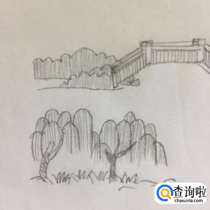 然后在拱桥的对面画出几棵柳树以及树下的小草,如下图所示。
