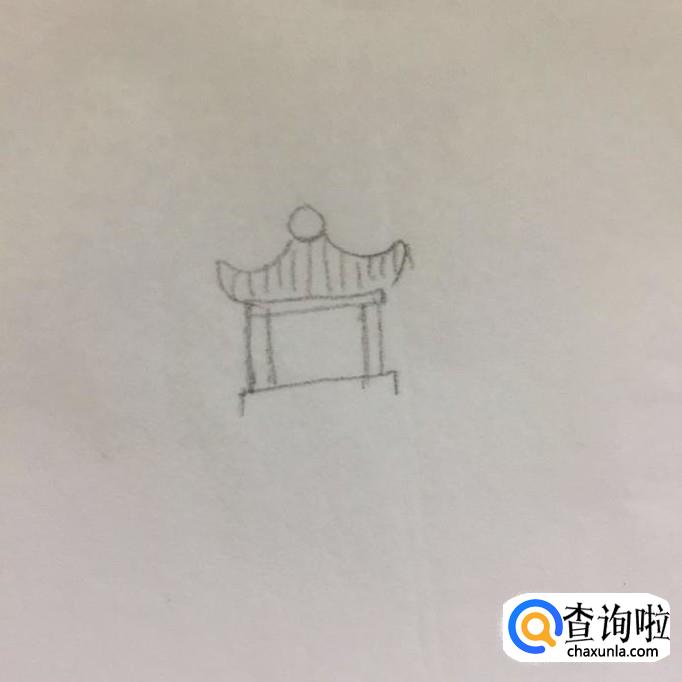 首先在a4纸上画出一个凉亭,如下图所示。凉亭的画法就是画出一个类似于金元宝的形状作为凉亭的屋顶,之后画出四条平行的直线作为凉亭的柱子就可以了。