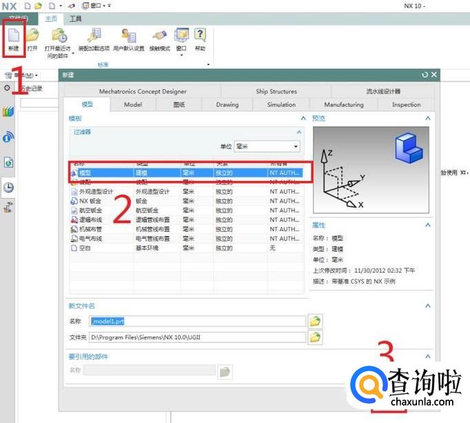 打开UG10.0软件,新建一个模型文件,具体步骤如下图所示的1、2、3号红色框选图标:新建-模型-确定。