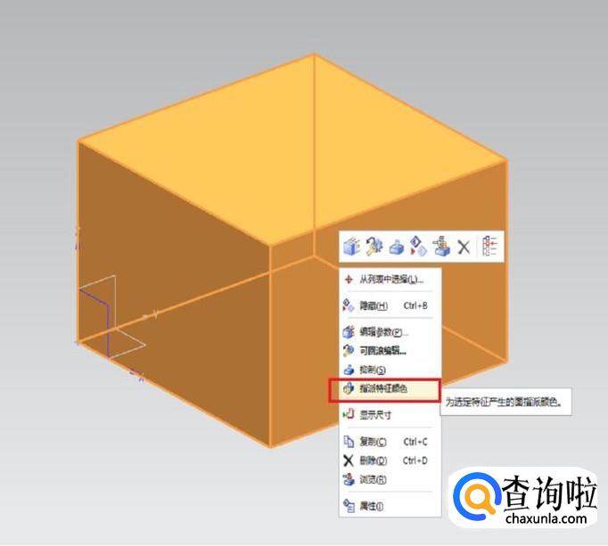 第一幅图:鼠标左键单击实体,选中之后单击鼠标右键,会有如下第一幅图所示的下拉菜单出现,然后就可以看到红色框选中的“指派特征颜色”。