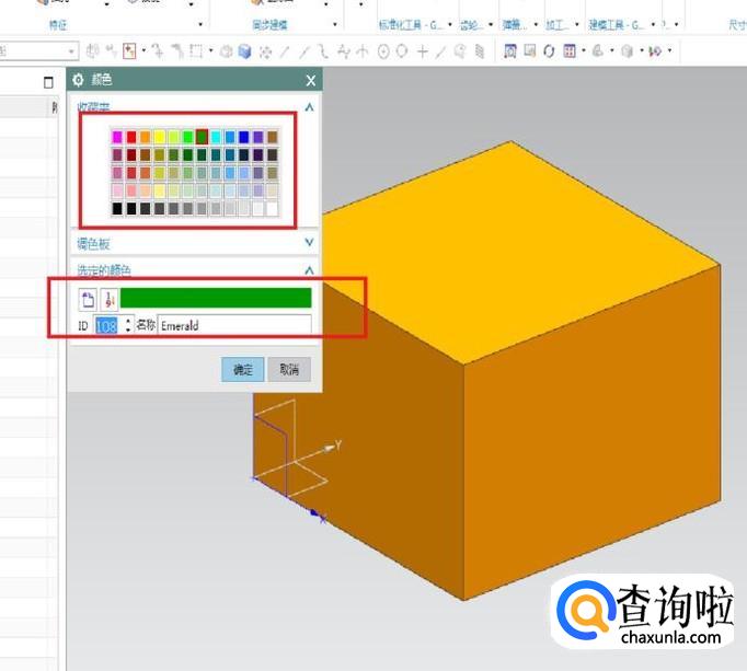 这个对话框会给我们提示我们需要做什么。首先第一项,要上色的特征(选择特征),软件已经默认了刚刚的长方体,所以这一步可以省略;然后第二项,特征面颜色,注意红色框选,可以看到软件默认的是“无颜色”。