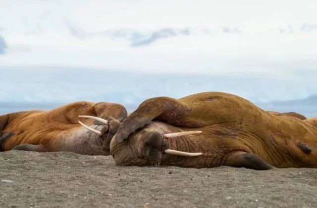 海象是出了名的瞌睡大王,一上岸就常常倒下身体酣然入睡。如果栖息地太小的话,甚至会两三层叠在一起,却依然睡得很甜。