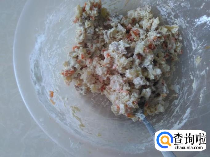 把200克糯米粉放到盘中,然后把过油盐的三丁铲上盘子混合。