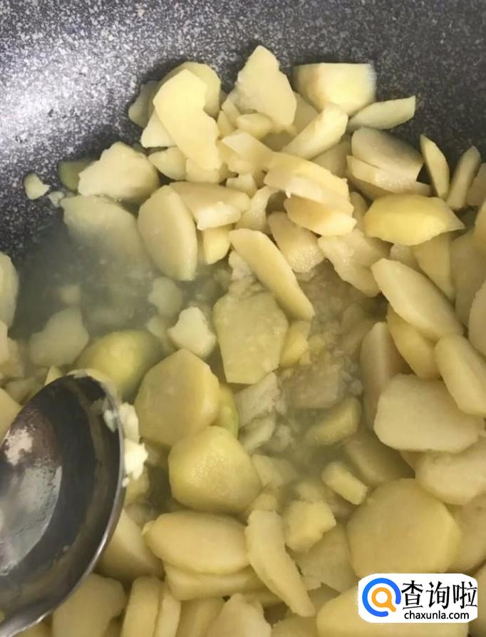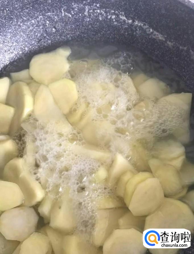 然后我们将土豆清洗干净,去皮,切厚片放入热水锅中,煮熟